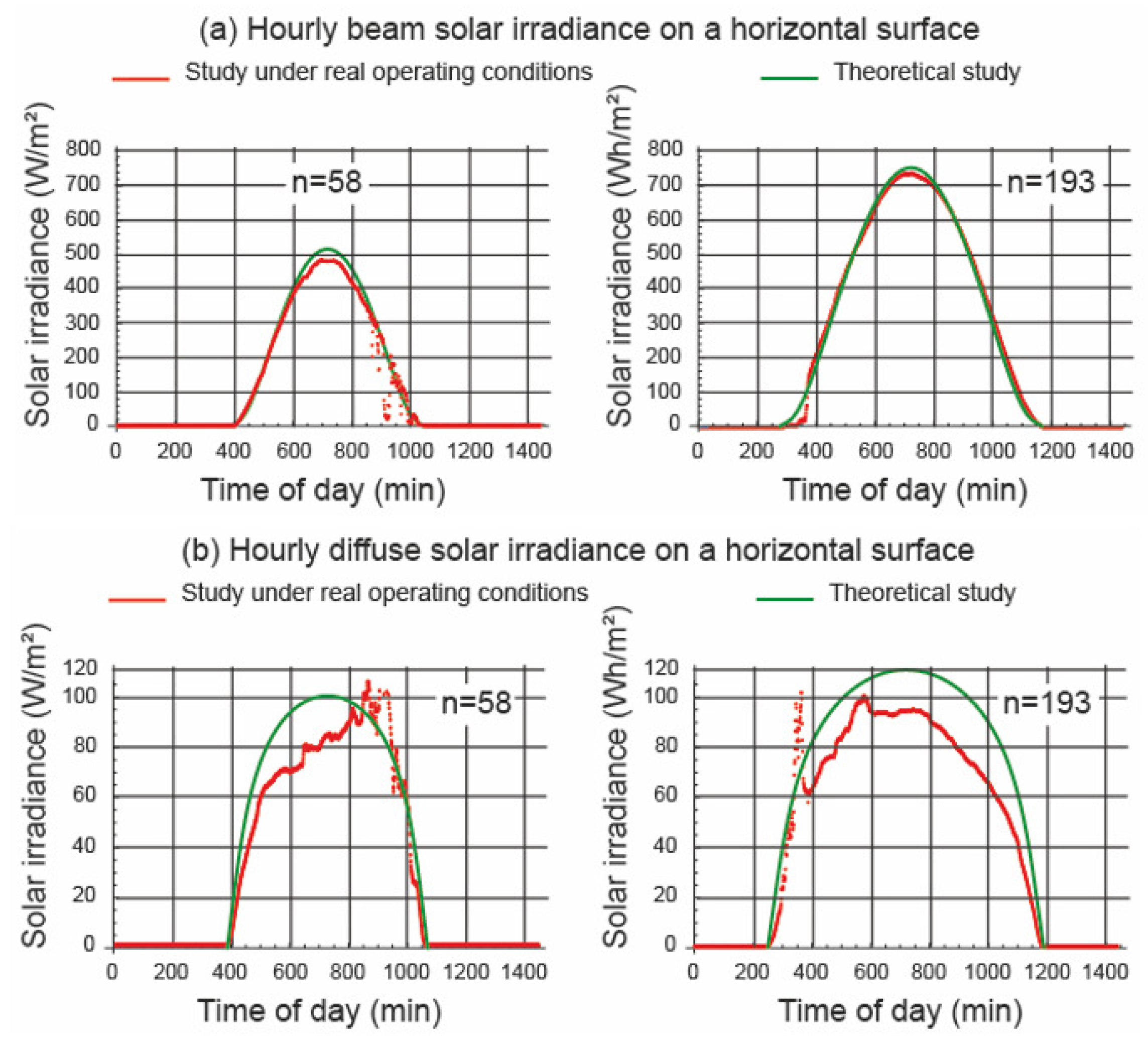 where is the hourly distribution of the beam horizontal solar irradiance (W/m2), is the variable geometric factor, which is a ratio of tilted and horizontal solar beam irradiance, n is the ordinal of the day (day), T is the solar time (h), is the zenith angle of the sun (°), and is the incident angle (°).