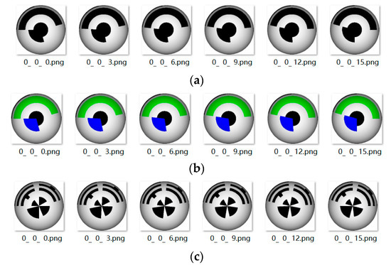 An implicit encoding method for the pose parameters, based on the file name, is proposed. The Euler angle (pitch angle, yaw angle, and roll angle) is embedded into the image file name in the format of “X_Y_Z.png” to avoid data management redundancy caused by independent annotation files. Through the design of the parsing script, the angle value in the file name is converted into a three-dimensional vector, which is used as the truth value label for the network training. The final dataset contains the image pose information that supports the end-to-end deep learning model training. Some of the datasets generated under different textures are shown in Figure 2 below.