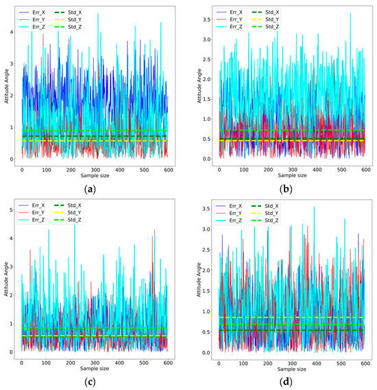 In this section, the performance of the CNN on the validation sets under different texture datasets is visually and quantitatively analyzed. The specific quantitative analysis results are shown in Table 1, and the visual analysis results are shown in Figure 3. In the table, (Err_X, Err_Y, Err_Z) represents the average angular error of the attitude angle corresponding to each coordinate axis; (Std_X, Std_Y, Std_Z) stands for standard deviation (Std); MAE stands for total mean absolute error; and RMSE stands for total root mean square error, which accounts for error magnitudes and is less prone to cancellation effects compared to the mean error metrics.
