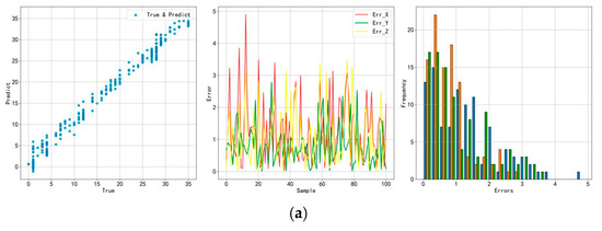 In this section, the performance of 100 test set images generated for each texture is analyzed and compared. The trained model is used to estimate the attitude of the test set, and the error distribution is visualized. The following visual analysis diagram is drawn, including a true forecast distribution scatter plot, an error line plot, and an error frequency domain histogram. In the scatter plot, the more concentrated the data distributed on the line where , the more accurate the attitude prediction is; otherwise, the larger the deviation is. The line chart can clearly and intuitively picture the specific error distribution trend; the histogram makes a statistical analysis of the individual axis error distribution. The detailed analysis is shown in Figure 4 below.