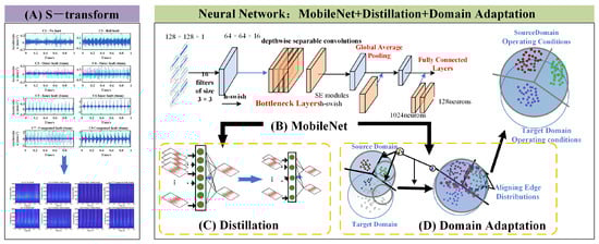 As shown in Figure 1, the proposed technical route for bearing fault diagnosis involves four key steps: vibration signal acquisition and preprocessing, time-frequency analysis using the S-transform, feature extraction using MobileNet as the backbone network, and model compression using knowledge distillation. This approach leverages the strengths of time-frequency analysis and deep learning to provide an accurate and efficient solution for bearing fault diagnosis. The use of MobileNet as the backbone network ensures that the model is lightweight and suitable for real-time applications, while knowledge distillation further compresses the model, making it deployable on resource-constrained devices. This combination of techniques offers a promising solution for the early detection and diagnosis of bearing faults, which is crucial for preventing catastrophic failures and reducing maintenance costs in industrial applications.