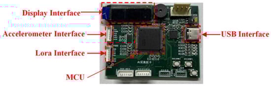 In Figure 2, a hardware platform is realized, including a microcontroller, an accelerometer port, a display port, and a serial port. The vibration signal is obtained from the accelerometer port. The sampling frequency is 10.24 kHz and the sample time is 5 s. An ARM Cortex-M4 32-bit RISC core is selected as the microcontroller, which is a low computing power platform. The Cortex-M4 core operates at a clock speed of 168 MHz with 1 MB of Flash memory and 192 KB of SRAM. Usually, it is noted that the traditional hardware is only designed to collect signal data. Different from that, our platform achieves completed signal collection with diagnosis inference, which decreases the communication consumption with high efficiency.