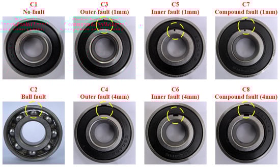 To validate the effectiveness of the proposed method, experimental data collected from a simulation test platform are used. As shown in Figure 4, the bearing fault types include NF, BF, IF, OF, and CF, representing five common fault models. Additionally, faults of varying severity levels for IF, OF, and CF are also included to assess the method’s adaptability to different fault severities. Given the limited number of data samples, the original data are divided using a 90% overlap, with each sample containing 10,240 data points. The dataset consists of 600 samples per fault type, totaling 4800 samples for all operating conditions.