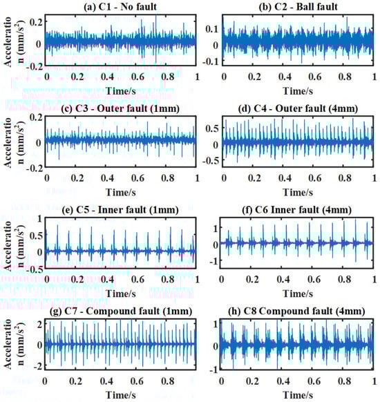 Figure 5 shows the time-domain waveforms of different bearing fault modes at 800 rpm. It can be observed that both healthy and rolling element faults lack clear periodic characteristics. This is due to the irregular vibration signals caused by the contact between the rolling elements and the inner and outer races, influenced by the load and contact angle. In particular, early faults produce weak signals that are easily masked by noise, making it difficult for traditional signal analysis methods to detect faults and leading to classification errors in data-driven models. Moreover, as fault severity increases, the amplitude of the waveforms in the OF, IF, and CF changes. Notably, in composite faults, the outer race fault dominates, causing the pulse features to resemble those of the outer race fault, which may lead to misclassification.