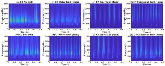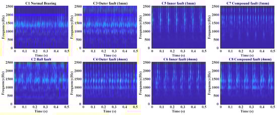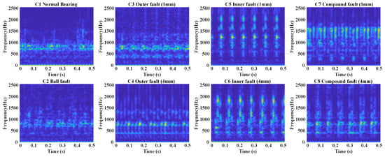 To address this, the S-transform is introduced to enhance frequency-domain feature extraction and improve signal separability. As shown in Figure 6, the S-transform combines the local properties of short-time Fourier transform (STFT) with the multi-resolution features of wavelet transform, providing detailed time-frequency information to capture signal variations. As a comparison, the Continuous Wavelet Transform (CWT) and STFT are presented in Figure 7 and Figure 8, respectively. Superior than CWT and STFT, the frequency spectrum generated by the S-transform effectively reduces noise interference, highlighting useful frequency-domain features and making different fault types easier to distinguish, thereby improving diagnostic accuracy. Additionally, compared to time-domain signals, the frequency spectrum from the S-transform is more compact, reducing data storage requirements for online deployment, which is suitable for embedded systems and edge computing devices.
