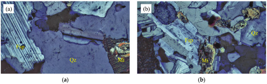 Polarized light microscope images of granite with different grain sizes: (a) coarse-grained granite (b) fine-grained granite. Qz: quartz, Fsp: feldspar, Mi: micas.