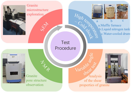 The heating of the granite specimens was conducted within a muffle furnace (TNX1200-30, Shenzhen Wance Testing Equipment Co., Ltd., Shenzhen, China), which has a maximum heating temperature of 1200 °C, a chamber volume of 12 L, a maximum heating rate of 20 °C/min, and a temperature control system consisting of a 30-segment intelligent program controller, a PID controller, and a silicon-controlled rectifier master controller. The variable-angle shear tests on the granite specimens after high-temperature cold shock were carried out using a computer-controlled electronic universal testing machine (ETM305D, Luoyang Chunqing Furnace Industry Co., Ltd., Luoyang, China). The loading system of the machine consists mainly of a movable crosshead, a reaction frame, a force sensor, a manual controller, and shear fixtures. The reaction frame is made of high strength alloy steel and has a maximum load capacity of 300 kN. The force sensor system utilizes Transcell load cells, with an accuracy of up to 0.04% FS. The shear fixture angle (θ) is capable of ranging from 5° to 70° in 5° increments. To assess the pore size distribution of the granite samples after saturation treatment, a MicroM12-025VR nuclear magnetic resonance (NMR) core analyzer was employed. The microstructure of the granite was observed using a JSM-IT300 scanning electron microscope (SEM). The corresponding experimental equipment is shown in Figure 2.