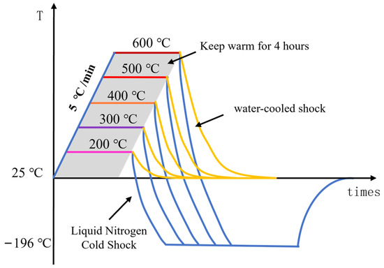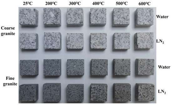 The granite samples were initially subjected to heating in a muffle furnace in order to simulate the ambient temperature of dry hot rock reservoirs. The heating temperatures were set at 200 °C, 300 °C, 400 °C, 500 °C, and 600 °C, and the heating rate was maintained at 5 °C/min [30] in order to avoid the occurrence of thermal shock effects during the heating process. Once the target temperature had been reached, the samples were held at the set temperature for a period of 4 h in order to ensure uniform heating. Thereafter, the samples were subjected to liquid nitrogen cold shock and water-cooling shock. Following this, the samples were removed from the liquid nitrogen and water, allowed to return to room temperature, and placed in an oven to dry at 105 °C for 24 h before further use. The detailed high-temperature cold-shock procedure is shown in Figure 3. The high-temperature treatment was conducted in the air environment of a muffle furnace (TNX1200-30) in order to simulate the actual conditions of dry hot rock reservoirs. While elevated temperatures can potentially induce mineral oxidation or phase transitions (e.g., the quartz α → β transition), all samples were subjected to identical thermal conditions to ensure reliable intergroup comparisons. Previous studies have demonstrated that within the temperature range of 200–600 °C, the effects of oxidation and phase transitions on the mechanical properties of granite are negligible [31]. Moreover, the present study focuses primarily on the interaction between thermal shock modes and particle size heterogeneity, with oxidation effects not constituting a core variable. The granite samples after high-temperature cold shock under different conditions are shown in Figure 4. The color changes observed in both coarse and fine granite were found to be predominantly influenced by the heating temperature, with minimal impact from the cold-shock method. Specifically, both granite types demonstrated a gradual color brightening with increasing heating temperature, which is attributed to the decline in mica content at higher temperatures [9]. The color change was more pronounced in the fine-grained granite, which underwent a transition from dark grey to grey-brown.