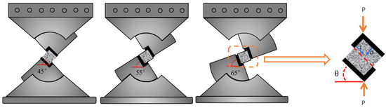The high-temperature, cold-shock granite specimens were situated at the center of the shear fixture for the purpose of conducting variable-angle shear tests. Based on validation from previous experimental results, specimens are prone to interfacial slip failure when the shear angle is below 45°, and data anomalies may occur due to moment imbalance when the angle exceeds 70°. Therefore, the range of 45–70° is considered a valid testing interval [32]. Accordingly, shear angles of 45°, 55°, and 65° were selected for this experiment. The fixture setup is shown in Figure 5. During the course of the test, according to the recommendations for rock shear tests issued by the International Society for Rock Mechanics (ISRM) [33], displacement loading was applied at a rate of 0.1 mm/min until specimen failure occurred.