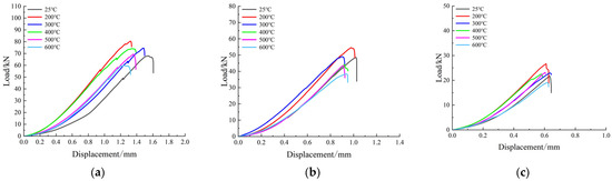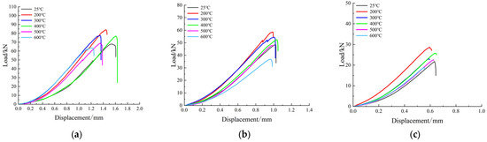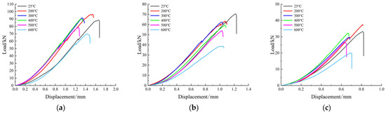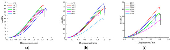 Shear load–displacement curve of coarse-grained granite subjected to water cooling: (a) 45°, (b) 55°, (c) 65°.