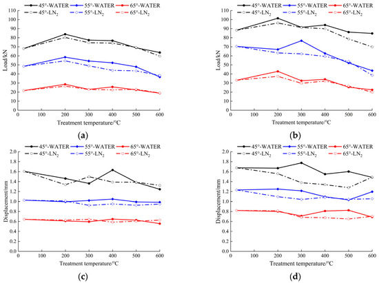 The load–displacement curves demonstrate that, for a given cold-shock method, both coarse-grained and fine-grained granite exhibit shortened compaction and linear elastic stages with increasing shear angle, with peak load and peak displacement decreasing continuously. This phenomenon is primarily attributable to the reduced normal stress on the granite, which reduces friction between internal particles and weakens its ability to resist shear loads [35]. Furthermore, as illustrated in Figure 10, at identical treatment temperatures and shear angles, high-temperature liquid nitrogen cold shock exhibited a greater effect on the peak displacement of fine-grained granite, with a smaller total displacement compared to high-temperature water-cooled shock. This phenomenon was less pronounced in coarse granite. The analysis suggests that fine-grained granite experiences greater thermal stresses under high-temperature liquid nitrogen cold shock, resulting in an increased number of thermally induced cracks. When shear loading is applied, these cracks propagate rapidly, significantly reducing the peak displacement. Furthermore, when the treatment temperature reaches 600 °C, both the peak load and peak displacement show a significant reduction, probably due to the α-β phase transition of quartz (≥573 °C), which causes crystal volume expansion and an increase in interparticle cracking, significantly degrading its mechanical properties [36].