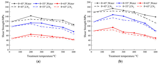 As demonstrated in Figure 11 and Figure 12, the trends in the shear mechanical properties of coarse- and fine-grained granite under different cooling methods are, in general, consistent. However, in comparison with water cooling, liquid nitrogen cooling results in reduced shear strength and cohesion for granite. To illustrate this, let us consider fine-grained granite under a shear angle of 45°. As shown in Table 2 and Table 3, the shear strength of granite increased by 10.2% and 3.3%, respectively, after 200 °C water-cooling and liquid-nitrogen-cooling shocks, while the cohesion increased by 24.5% and 9.1%, respectively. Conversely, when subjected to water-cooling shock or liquid-nitrogen-cooling shock at 600 °C, the shear strength of granite decreased by 12.2% and 28.2%, respectively, while cohesion declined by 42.4% and 44.8%, respectively. These findings suggest that liquid-nitrogen-cooling shock diminishes the thermal hardening effect and amplifies the thermal damage effect in granite. This phenomenon can be attributed to the greater temperature difference between liquid nitrogen and high-temperature granite compared to that between water and high-temperature granite. When granite is subjected to liquid nitrogen, the thermal stresses generated within the material are greater than those generated by water, resulting in a greater number of thermally induced cracks [30]. This ultimately leads to a reduction in shear strength and cohesion in liquid nitrogen-shock-cooled granite compared to water-shock-cooled granite at the same heat treatment temperature.