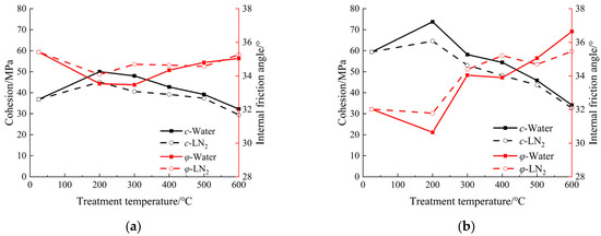 - Granite shear strength and cohesion generally exhibit a trend of initial increase followed by a decrease with rising thermal treatment temperatures, whereas the internal friction angle shows an inverse trend. Notably, the thermal hardening effect is most pronounced at 200 °C. Furthermore, at the same thermal treatment temperature, granite subjected to liquid nitrogen thermal shock has lower shear strength and cohesion compared to granite treated with water thermal shock.