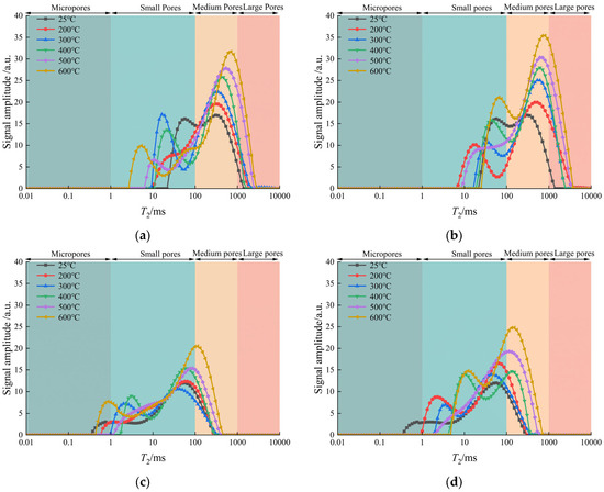 The T2 spectral curves of granite after different heat treatments are shown in Figure 14, from which it can be seen that the peaks of the T2 spectral curves are mainly bimodal, and most of the curves between the two peaks are smoothly and continuously connected, indicating that the pore connectivity of different dimensions within the granite is relatively good. Overall, the peaks and areas of the spectral curves gradually increase with increasing heat treatment temperature, indicating that the high-temperature cold shock can affect the pore structure of the granite and promote the development of pores [45]. Comparing the T2 spectral curves under different cooling modes, it is found that the elevation and right shift of the second peak of coarse and fine granite under liquid nitrogen cold shock are more significant, indicating that the size and number of pores have been greatly increased, and liquid nitrogen cold shock has effectively changed the distribution of pores; furthermore, the peaks and valleys between the two peaks have been shifted upward more obviously with the increase in heat treatment temperature, which means that compared with water-cooled shock, liquid nitrogen cold shock can effectively improve the connectivity between the pores of granite. This indicates that compared with water-cooled shock, liquid nitrogen cold shock can effectively improve the connectivity between the pores of granite.