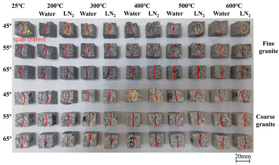 As illustrated in Figure 14, the macroscopic failure images of coarse- and fine-grained granite in variable-angle shear tests demonstrate that failure of the specimen primarily occurs along the shear plane. Under identical heat treatment conditions, when θ = 45°, a significant number of fragments are ejected during failure, and the surface of the specimen forms pronounced spall craters, with only a few cracks around the shear failure plane. Conversely, at an angle of 65°, the specimen predominantly fails along the shear plane, exhibiting a relatively flat shear failure surface, a hallmark of pure shear failure. This phenomenon can be attributed to the increasing shear stress, which, at higher angles, causes the variable-angle shear test to approach a direct shear test. Conversely, as the shear angle decreases, the proportion of compressive stress increases and the compressive stress inhibits shear failure, rendering the variable-angle shear test more analogous to a uniaxial compression test [25]. With increasing heat treatment temperature, the degree of fracture of coarse- and fine-grained granite at the same shear angle generally increases, and this phenomenon is more pronounced in the samples treated with liquid-nitrogen-cooling shock. This is related to the decrease in cohesion with increasing heat treatment temperature, as mentioned in Section 3.2.2. The high temperature reduces the cohesion within the specimen and weakens the cementation between the particles. When the specimen is loaded, the thermal cracks join and propagate rapidly, resulting in higher fracture levels at failure.