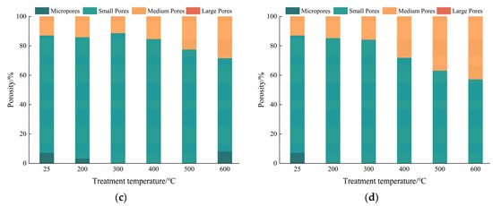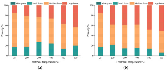 The proportions of different types of internal pores in granite under various thermal shock conditions are shown in Figure 15. The distribution of different pore sizes in granite under high-temperature cold-shock conditions is observed to vary with heat treatment conditions. In particular, the pore structure of coarse granite is dominated by medium pores and large pores, whereas that of fine-grained granite is dominated by small pores and medium pores. It is evident that within the temperature range of 25 °C to 400 °C, the pore structure of both coarse- and fine-grained granite exhibits negligible changes in response to water-cooling shock. However, a pronounced alteration in pore structure is observed under liquid-nitrogen-cooling shock conditions. Specifically, the proportion of large pores in coarse granite increases from 15.64% to 38.02%, while the proportion of medium pores in fine granite rises from 12.88% to 28.4%. This observation indicates that liquid-nitrogen-cooling shock significantly increases the proportion of medium pores and large pores within the granite [44], which macroscopically weakens the shear mechanical properties of the granite. This finding is consistent with the results reported in Section 3.2.2. Within the range of 400 °C to 600 °C, the proportion of large pores and medium pores in both coarse- and fine-grained granite increases dramatically under both cooling methods, indicating that high temperature severely damages the internal pore structure of granite. It is noteworthy that under high-temperature cold shock, the proportion of large pores in coarse-grained granite increases with heat treatment temperature, while the proportion of medium pores in fine-grained granite increases with heat treatment temperature. This finding indicates that the deterioration of shear mechanical properties in coarse-grained granite is predominantly attributable to alterations in large pores induced by high-temperature cold shock, while the degradation observed in fine-grained granite is attributed to changes in medium pores.