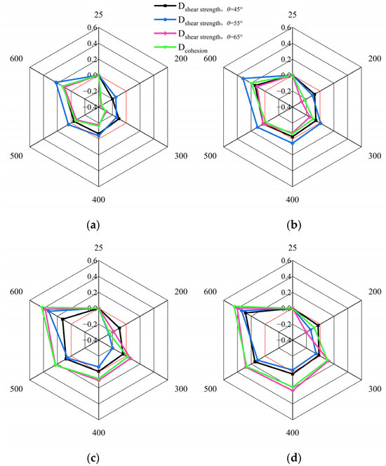 where WT and W0 are the mechanical properties (shear strength and cohesion) of the granite before and after the heat–cold impact, respectively. Compared to conventional damage variables, if D is negative, it indicates that thermal hardening of the rock is occurring at this time.