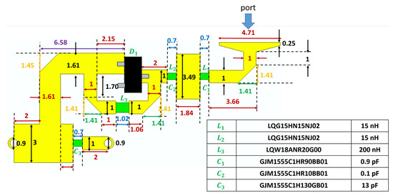 The circuit includes the used Schottky diode, inductors, and capacitors with lumped element models. Specifically, to obtain even more realistic results, the S-parameter models of the individual components (provided by the manufacturers, in our case, Murata [32]) are included in the simulator. The presence of these components significantly reduced the circuit’s size compared to a fully microstrip version [33]. This design strategy has been carried out with the aim of making the doubler circuit integrable with a small antenna to compose the tag.