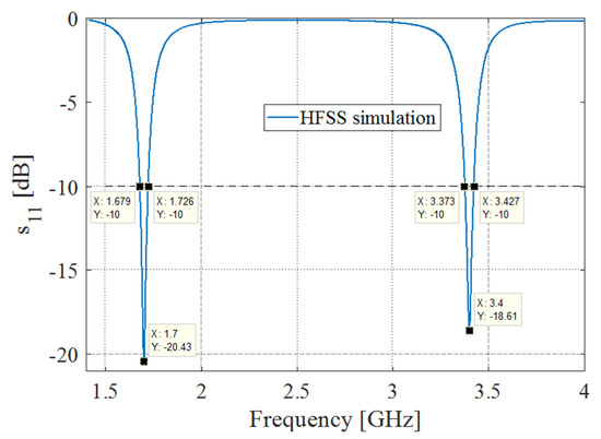 Despite the handmade realization of the antenna prototype, the measurement of the reflection coefficient of the antenna reveals minor discrepancies compared to the simulations, as shown in Figure 15. It is well-matched at both frequencies of 1.7 GHz and 3.4 GHz but simulation results appear a little bit better than measurements.