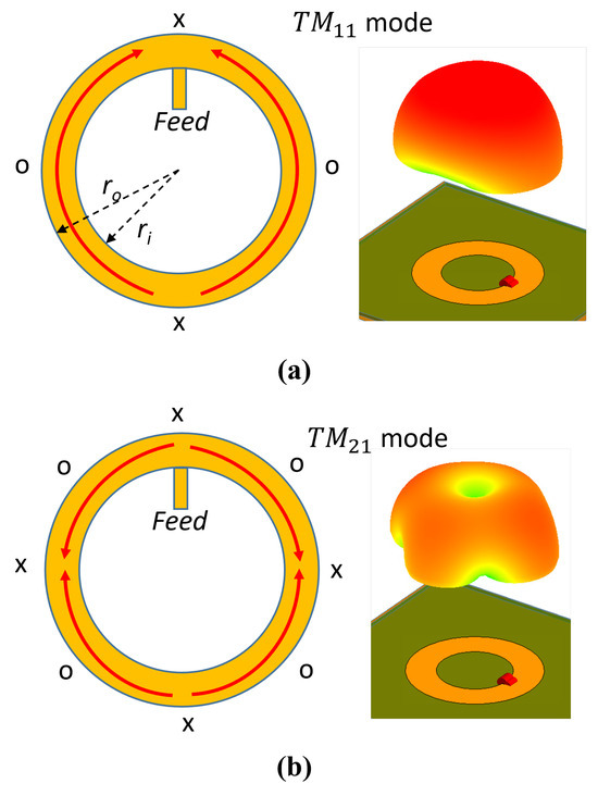 Schema of annular ring microstrip antenna fed by a microstrip line; and are outer and inner radius, respectively. Red arrows represent currents, crosses position of nulls (or minima) of current, circles maxima of current. On right side, the corresponding radiation patterns. (a) mode; (b) mode.