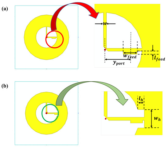 (a) Initial layout of the annular ring antenna with relevant symbolic dimensions; (b) Application of the rectangular indent near the feed point located on the horizontal microstrip line.