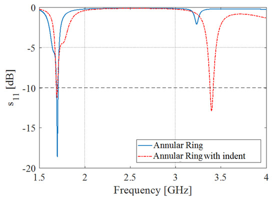 The antenna design procedure encompassed several steps. The initial one involves the dimensioning and simulation of the annular ring’s geometry [38], but it did not yield the impedance matching condition on both desired frequency bands. To achieve impedance matching at the second harmonic, a rectangular indent is added at the end of the horizontal microstrip feeding line. The application of this geometric modification, as shown in Figure 6b, facilitates the relocation of the feeding point, effectively ensuring impedance matching at 3.4 GHz. The reflection coefficient for the layouts depicted in Figure 6 is reported in Figure 7.