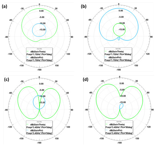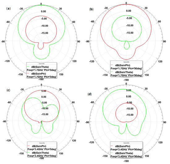 Radiation patterns of the gain expressed in dBi: (a) results obtained at 1.7 GHz for ; (b) results obtained at 1.7 GHz for ; (c) results obtained at 3.4 GHz for ; (d) results obtained at 3.4 GHz for . In the figures, the green curves represent the gain plot of component, and the red ones are the component.