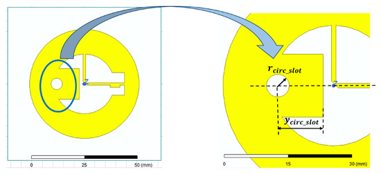 To achieve a maximum radiation pattern at , , even at the second resonant frequency, a rectangular protrusion (like a stub) has been added to the annular ring antenna and positioned on the opposite side of the rectangular indent. This modification is illustrated in Figure 9, which also includes a circular slot whose function is explained below.
