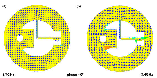 Surface currents flowing on the surface of the annular patch: (a) currents at 1.7 GHz; (b) currents at 3.4 GHz.