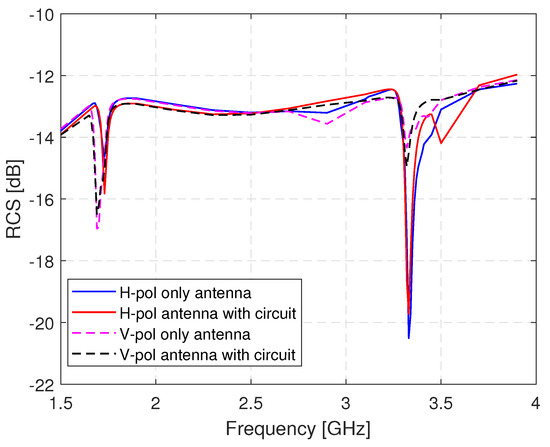 For this purpose, we calculate the monostatic Radar Cross-Section (RCS) of the tag at the two considered frequencies. To analyze the effect of the coupling between the doubler circuit and the antenna, we compare the RCS obtained when the doubler circuit is integrated inside the antenna with the RCS computed by terminating the antenna port on a load that incorporates the frequency-dependent scattering parameters of the doubler circuit alone. This approach allows us to isolate the impact of the circuit integration on the antenna’s scattering properties. The simulation is performed in Ansys HFSS, modeling a pair of plane waves impinging on the tag from the boresight direction with linearly polarized electric fields, one vertically and one horizontally polarized.