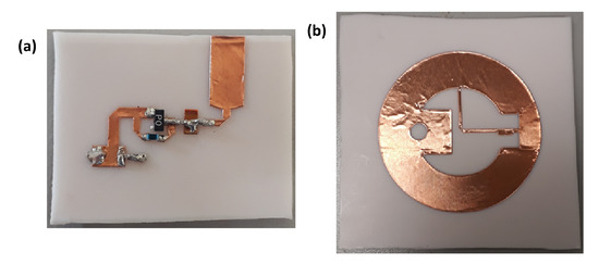 For realizing a prototype of the designed harmonic tag, we use a substrate made of Teflon, which has , , and thickness mm. The different metallic components that constitute the circuit and the antenna (microstrips, patches, and ground planes) are made with 35 m thick adhesive copper. The layouts for metallic components are realized using the Secabo C60 IV cutting plotter. Photos of the prototypes can be seen in Figure 14. Inductors, capacitors, and the Schottky diode (HSMS-2850) are soldered using traditional tin alloy soldering. Prototypes of the dual-band matching circuit and the final annular antenna are realized separately in order to check their behavior separately before the final assembly (Figure 14a,b).
