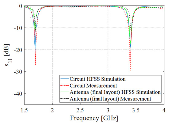 The reflection coefficient of the doubler circuit is carried out using the Anritsu MS46122B vector network analyzer. A 30 dB attenuator has been placed between the VNA and the port of the circuit. This setup allowed for the measurement of the circuit’s behavior under conditions similar to those assumed during simulation (i.e., with input power of −30 dBm). In fact, the nonlinear behavior of the Schottky diode makes its impedance change with the variation of the input power. The comparison between the measured reflection coefficient and the simulated one is presented in Figure 15, which also shows reflection coefficients of the antenna. As evident, measurements agree with simulations: both bands at 1.7 GHz and at 3.4 GHz have a reflection coefficient lower than −10 dB. The measured reflection coefficient of the circuit appears a little bit better than that of the simulated model likely because the prototype has losses greater than that of the model.