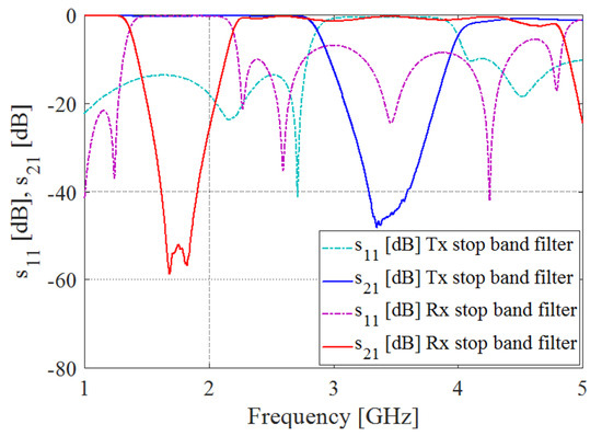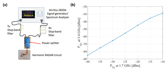 In order to asses the capabilities in re-transmitting the second harmonic, a continuous wave (CW) signal at a specific frequency has been sent to the input port of the doubler circuit and the power returned in the second harmonic is measured. To achieve this, the circuit has been connected to the Anritsu MS2830A signal generator/spectrum analyzer using two band-reject filters and the Anaren 42,100 power splitter. The transmission filter is inserted to further attenuate the second harmonic of the transmitter while the receiving filter was added to prevent receiver saturation at the frequency of the first harmonic. The setup is sketched in Figure 16a. Figure 17 presents the measured reflection and transmission coefficients of the two band-reject filters used in this measurement. A CW signal at 1.7 GHz is transmitted with a variable power to the doubler circuit while the power received at 3.4 GHz is measured. Figure 16b displays the measurement results, after removing the losses introduced by various components in the system (cables, filters, power splitter). That measurement permits us to retrieve the conversion loss of the circuit, which is variable with the input power—in fact, it is lower for high input power and higher for low input power (e.g., the conversion loss is about 18 dB for dBm while it is 35 dB for dBm).