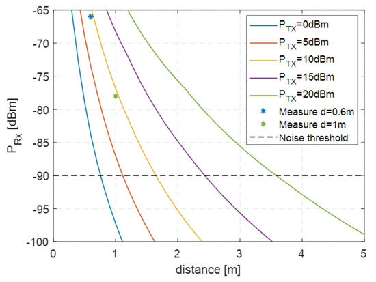 Denoting with L the losses of cables and filters used for measurements, the actual received power is . Graphs of are shown in Figure 21 as function of tag distance for different values of the transmitted power. The received power decreases rapidly with the distance from the tag but, for a sufficient transmitted power (for example 20 dBm), the tag can be read from a distance greater than 3 m. The asterisks shown in the picture report the value of the measured received power for a transmitted power of 9 dBm (at the output port of generator) when the tag is at 60 cm and 100 cm of distance. It is evident that the measurements agree well with the theoretical curve.