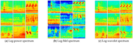 For the log-power spectrogram, the parameters of STFT are as follows: 512 frequency points, a window length of 512 samples and a 75% frame overlap. For the log-Mel spectrogram, using the same STFT parameters, the number of Mel filters is 40. The log-wavelet spectrogram was computed with a frame length of 257 samples, 75% overlap between frames and 258 wavelet bases, enabling detailed time–frequency analysis for feature extraction.