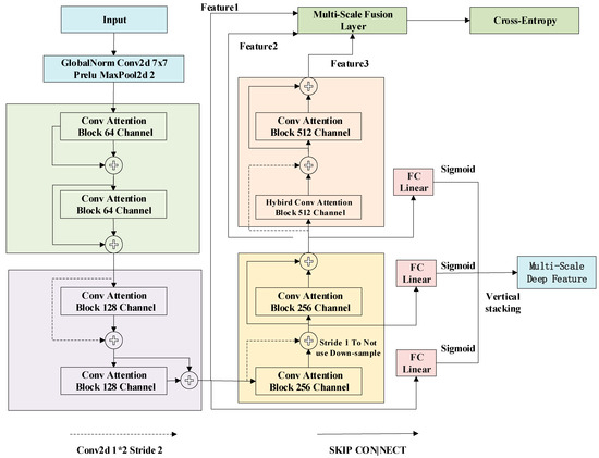 The MUSCA begins with a 7 × 7 convolutional layer to down-sample the input features and generate a feature map with 64 channels, which is then fed into the hybrid convolutional attention block. Within this block, some input feature maps undergo down-sampling with a stride of 2, reducing the feature map size to decrease computational load and filter out irrelevant features. The model then utilizes two hybrid convolutional attention blocks with skip connections to form a residual block, allowing the network to learn residual mappings instead of direct mappings [11]. This design facilitates easier gradient flow through the network, addressing issues of vanishing and exploding gradients. Through multiple convolutional down-sampling and residual operations, the model generates feature maps at large, medium and small scales. These multi-scale feature maps undergo global average pooling, and the resulting features are passed through fully connected layers to obtain classification probabilities for multiple categories. These probabilities are normalized to the 0–1 range using the sigmoid activation function. The multi-scale predictions are concatenated, and the combined output is compared to the one-hot encoded true labels using binary cross-entropy loss. This step reduces inter-class distance and weakens irrelevant features. The design idea refers to the backbone network of YOLOv3; by down-sampling the image and combining deconvolution up-sampling, the multi-scale features are spatially aligned to achieve multi-scale fusion [16]. Similar to this, our method also uses multi-scale feature maps, and the global average pooling features from large, medium and small scales are sent to the multi-scale feature fusion layer. Global average pooling is used to reduce the spatial dimension of the feature map while retaining the channel information. It also helps to avoid overfitting by reducing the number of parameters. The layer integrates, weighs and scales features from different scales and then maps the aggregated features to the final category probability through the fully connected layer.