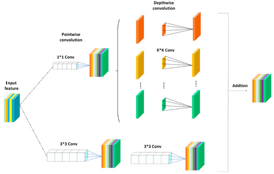 Hybrid Convolution: The mixed convolution block, as depicted in Figure 4, amalgamates depthwise separable convolution with traditional convolution blocks. Depthwise separable convolution autonomously executes spatial convolution operations on each input channel, enabling it to capture feature information from each channel individually. Meanwhile, the convolutional block comprising two traditional convolutions conducts inter-channel and spatial convolution operations on the input to capture feature information across channels. The features derived from depthwise separable convolutions and ordinary convolutional blocks are fused through element-wise addition.