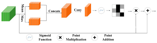 Spatial Attention Mechanism: Integrating spatial attention into the convolution block aims to enhance the model′s attention to various spatial locations in the input feature map and improve its ability to capture relevant spatial features, thereby improving its overall performance and generalization ability, as shown in Figure 6. Initially, the spatial attention mechanism computes the maximum and average values of the input features along the channel dimension, resulting in a feature map with identical dimensions as the input but with a single channel. Subsequently, these maximum and average values are concatenated along the channel dimension to form a feature map with two channels. This feature map then undergoes 2D convolution to fuse the bilinear features, following which the sigmoid activation function is applied to normalize the values between 0 and 1, yielding spatial attention weights. These weights are then multiplied elementwise with the input features, and the resulting product is added to the input to mitigate potential errors in subsequent layers due to deviations in spatial attention weights. The detailed structure of the spatial attention mechanism is elaborated in the diagram.