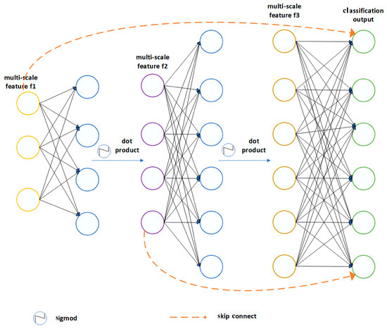 The three features in Figure 7 are derived from the feature maps after the last three down-sampling operations in the model and the results obtained after global average pooling. Specifically, feature 1 is the pooling result of the current layer, and feature 2 is the pooling result of the previous scale. Through the above operations, the fusion and guidance between different scale features are realized. Firstly, feature 1 is mapped to a high-dimensional space through the fully connected layer, and then the result is normalized to the range of 0–1 using the sigmoid function and multiplied by feature 2. This stacking of multi-layer features is performed in this way. In addition, a skip connection is used every three layers to avoid overfitting due to the excessive number of fully connected layers. These operations facilitate the effective fusion and combination of features in the feature space and enhance the representation ability and overall performance of the model.