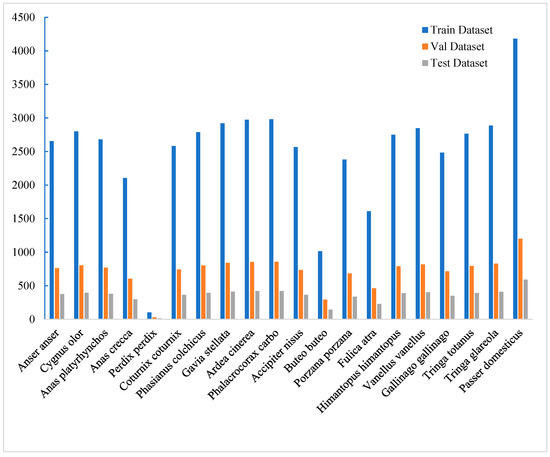 The data used in this study are from the publicly available dataset provided by the Beijing Academy of Artificial Intelligence (BAAI), which is from https://www.birdsdata.com/ (accessed on 20 July 2024). The dataset comprises the sounds of 20 common bird species in China, spanning eight orders, 12 families, 18 genera and 20 species, with a total of 14,311 natural audio clips, each clip lasting 2 s. In this study, effective data preprocessing is performed on the original audio before resampling to prevent obvious frequency aliasing after the sampling rate is reduced. Subsequently, the audio is resampled to 16 kHz, which is sufficient to cover the basic frequency information of most bird calls and can reduce the computational cost of model training. In addition, there are often local differences in the performance of bird sounds in the time dimension and spectrum. The audio is divided into frames of 400 ms. Through segmentation processing, the representative acoustic features in the local time range can be captured more accurately, thereby enhancing the model′s perception of short-term audio modes and improving the overall classification performance. In addition, three spectral features of log-Mel, log-power and log-wavelet are used to extract more comprehensive frequency domain and time-varying features, which enhances the recognition ability of the model under the limitation of sampling rate. Subsequently, the dataset was divided into the training set (50,088 clips), validation set (14,382 clips) and test set (7085 clips) at a ratio of 7:2:1. The distribution of each category in the segmented dataset is shown in Figure 8.