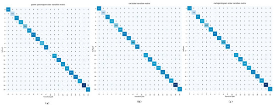 The classification accuracy of the test set in each spectrogram. (a) Confusion matrix of log-power spectrogram; (b)confusion matrix of log-wavelet spectrogram; (c)confusion matrix of log-Mel spectrogram.