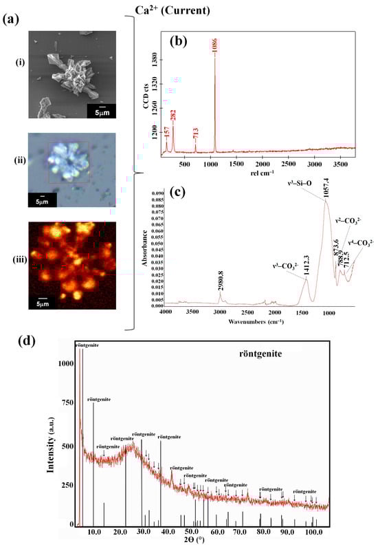 Characterization and identification of the calcium silica–carbonate biomorphs synthesized on obsidian under standard atmospheric conditions. (a) Micrographs: (i) SEM, (ii) optical image, (iii) Raman map (1086 cm−1); (b) Raman spectra; (c) FTIR spectra; and (d) PXRD.
