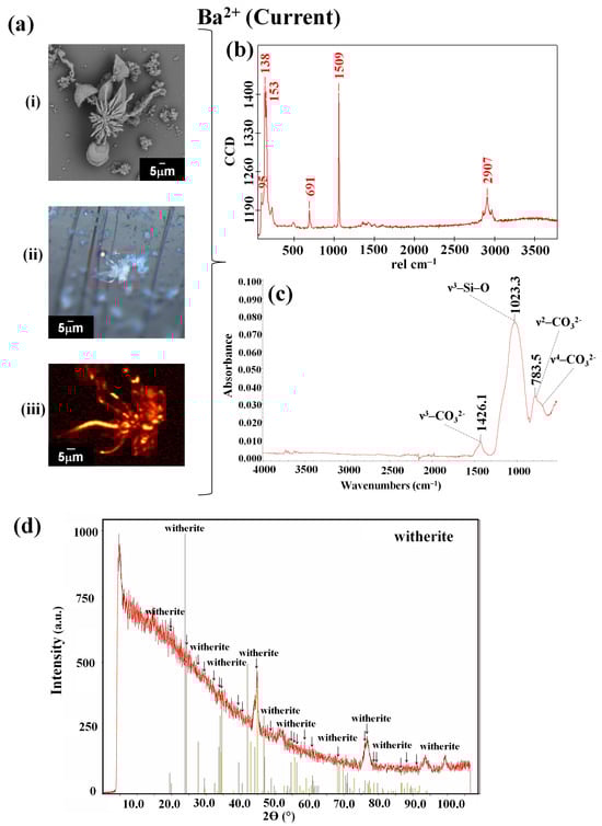 Identification via Raman spectroscopy (b), IR (c), and PXRD (d) of the barium silica–carbonate biomorphs synthesized under current atmospheric conditions. (a): (i) SEM micrograph; (ii) optical image obtained with the Raman microscope; (iii) Raman map (1509 cm−1).