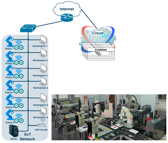 In this chapter, we will describe the test system architecture used to evaluate the IDS system in DT. We will also discuss the datasets chosen for this analysis. The system is used to monitor a network composed by a set of industrial devices which are creating a cyber–physical system presented in Figure 1. The physical part is represented by a flexible manufacturing cell composed of a set of six Omron industrial robots connected together with a closed loop conveyor belt. Each robot is monitored by an IIoT system based on the Arduino platform, which collects a set of data (like energy consumption, vibration, temperature, etc.) which cannot be collected directly by the robot controller, and a C# application which is running on a workstation connected to the robot controller through the Omron Automation Control Environment API and is collecting data from the robot controller. The Arduino IIoT systems are connected using WiFi connections to a router inside the robot network, and from there to the DT, which is running in a container in the cloud (for each robot there is a DT available in the cloud); the Arduino IIoT systems are used only for telemetry (they are just monitoring the robot parameters and sending the data to the DT). The C# applications are collecting data and sending them to the DT, but also can receive commands from the DT. In the network, there is also a server used for production planning and management, which is also used for testing different data aggregation methods. The network also has other devices which are connected, like a PLC (Programmable Logic Controller) which controls the production and a set of workstations, which are not present in Figure 1. The setup is implemented in a laboratory environment located at the National University of Science and Technology Politehnica of Bucharest, Faculty of Automatic Control and Computers, in the laboratory of Industrial Robots and Manufacturing Control. The DT is used to test a high availability (HA) solution for a flexible manufacturing cell implemented with a closed loop conveyor belt and six industrial robots. The robots are configured into an HA cluster which allows (in the case of a robot malfunction) the migration of the tasks between robots, offering continuous production. For this, each robot is monitored and its status and memory (variables, programs, and execution pointers) are saved in the cloud using real-time communication. These particular robots do not possess backup batteries for the memory, so in a case of power failure the production must be started from the beginning. The DT compensates for this deficiency by allowing a recovery procedure which will allow the transfer of the controller memory back from the cloud and continue the production from the last saved point under operator supervision. The DT is also used to administer the HA cluster (transferring the tasks between robots, and removing or adding a robot in the cluster). This is the setup of the industrial system, which is not imposing constraints on the security solutions; this setup was chosen in order to have a diverse set of data and communication protocols.
