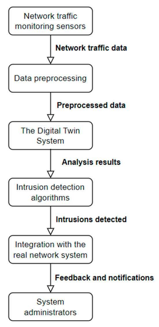- DT System: A virtual replica of the network system that receives preprocessed data, enabling the analysis and identification of suspicious behaviors and intrusions.
