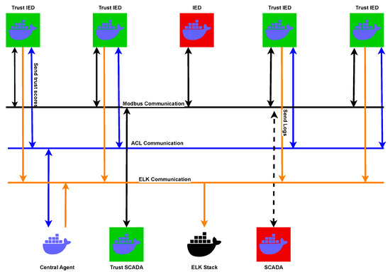 CIC Modbus is a dataset designed specifically for industrial control systems (ICSs), focusing on network traffic using the Modbus protocol, which is widely used in industrial automation. It includes both normal communication patterns and various cyberattacks targeting ICS environments, such as Denial-of-Service (DoS), Man-in-the-Middle (MitM), and reconnaissance attacks. The dataset aims to support research in anomaly detection and cybersecurity for critical infrastructure, providing labeled traffic that helps in training and evaluating intrusion detection systems. We followed the same procedure as with the previously presented datasets, namely, analyzing the traffic with Zeek and converting the files into CSV format. Figure 3 illustrates the simulated network architecture to create the CIC Modbus Database. The CIC Modbus dataset was created using Wireshark captures from a simulated Docker-based environment, where containers simulated IEDs and SCADA HMIs exchanging data over the Modbus protocol. While secure devices had detection agents that sent security scores, insecure ones operated solely with scripts, lacking protection mechanisms.