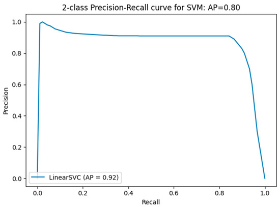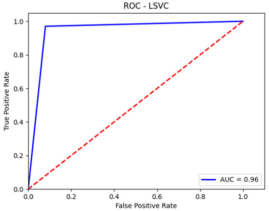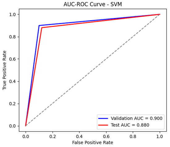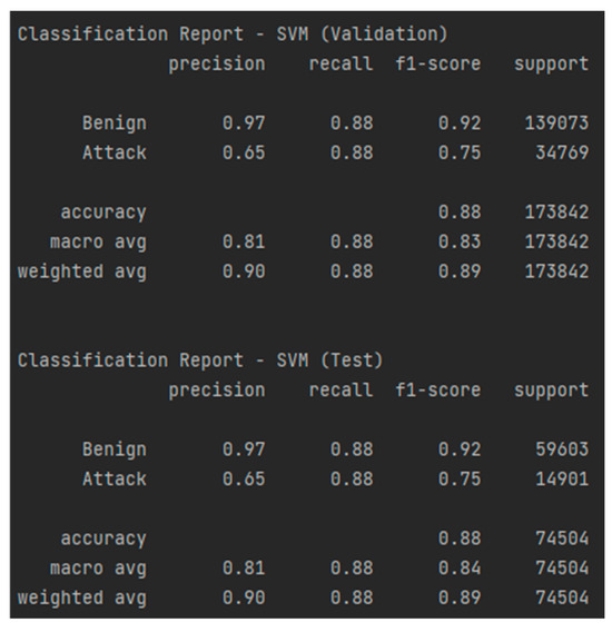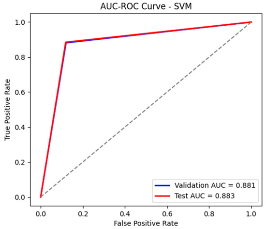 Furthermore, the prediction accuracy for the malignant class (attacks) obtained by the SVM model exceeds that for the benign class (normal traffic). Prioritizing the prediction accuracy of malignant traffic is advisable, as misclassifying benign instances as attacks is generally preferable to incorrectly classifying attacks as benign. These details are reflected in the confusion matrix presented in Table 3 and the classification report shown in Figure 4. Additionally, Figure 5 illustrates the AUC-ROC (Area Under the Curve–Receiver Operating Characteristic) curve for the validation set using the SVM model.