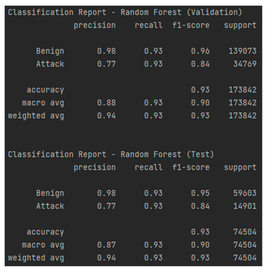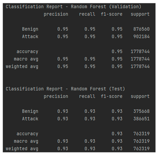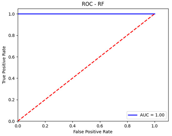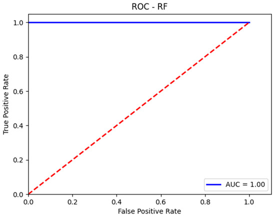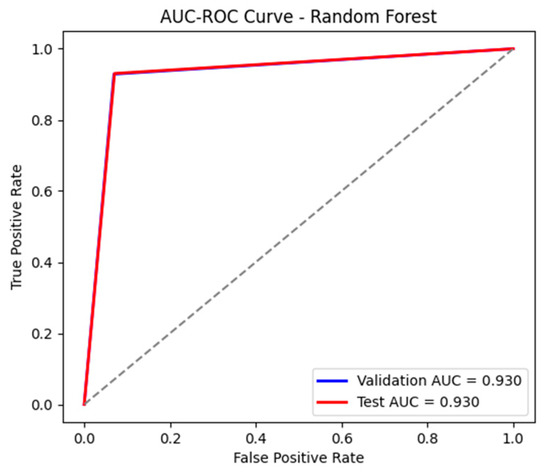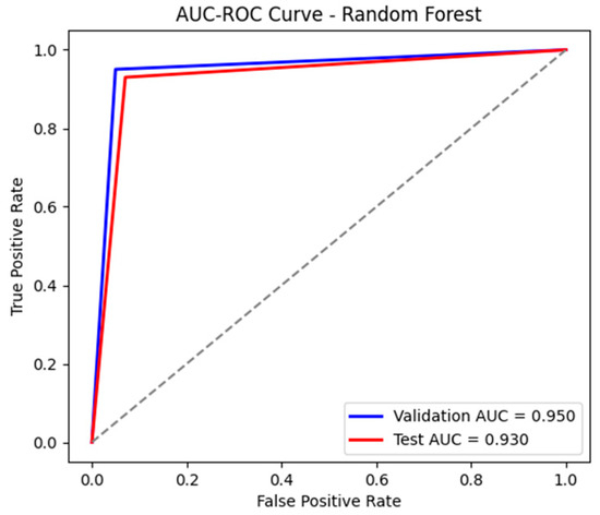 The RF model achieved remarkable performance in classifying industrial network traffic, demonstrating an accuracy of 95% on the validation set and 93% on the test set. The precision and recall of 95% for both classes during validation indicate a perfect balance between correctly classifying benign traffic and attacks, with a minimal error rate, as shown in Figure 22. On the test set, performance remains stable, with a precision and recall of 93%, suggesting good generalization capability. The AUC-ROC of 0.95 on validation and 0.93 on testing, as presented in Figure 23, confirms the model’s robustness, indicating excellent separability between normal and malicious traffic. The confusion matrices, as shown in Table 14 and Table 15, display low false positive alert values, making this model a strong security solution.