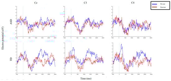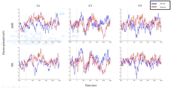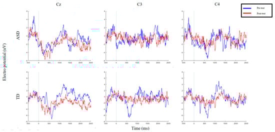 - Immediate Response (Unexpected Situations): Both autistic students and typical students with social difficulties showed significant responses when facing unexpected situations. After the social course, the post-test responses at Cz and C4 for autistic students were more active. Typical students with social difficulties also showed brainwave responses at Cz and C4, indicating that both groups of students are able to think about how to address problems in situational contexts (see Figure 5).