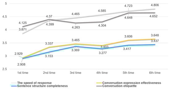 The “integrity of sentence structure” also showed a trend of initially rising and then declining, which is similarly speculated to be due to students responding in a more relaxed and casual manner as they become familiar with the testers and the virtual characters on screen. This is somewhat similar to the common progression of social interactions. As we become familiar with friends or classmates, we tend to use less formal language, which aligns with typical social norms.
